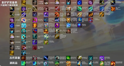 这款游戏中的装备合成的主要分为四十五件,基础的小装备主要有着9件。不同的小装备搭配可以合成出不同装备。在对局的前期,我们有机会获得小件装备,小件装备可以提升我们的攻速、魔抗、护甲或者是暴击率等属性。2件小件装备即可合成一个大装备,大装备除了会提高加成之外,还有可能给我们带来更多的“技能”。如死亡后可以复活的“复活甲”一次攻击可以同时发射攻击多个敌人的“分裂弓”等等。另外值得一提,就是游戏中的“金铲铲”装备啦~这个可以说是一个“万能”装备。两件“金铲铲”可以合成“自然之力”增加人口,而一件“金铲铲” 其他小件装备,则可以助力我们的棋子额外获得一个“羁绊属性”。除了可合成的45件装备以外,还有着8个古代装备可以获得,分别为红霸服、反甲、沉默刀、巨九、降星刀、神圣之剑、幻影之舞、卢登的回声。