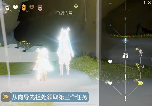 1、风行季地图中央与飞行向导互动后点击倒数第三个感叹号即可领取第三个季节任务(飞行向导的位置在风之大道主岛中间的洞窟里)。