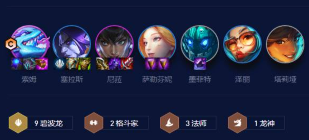 1.首先推荐的是9碧波龙3法师2格斗,前期尽量用强势棋子与羁绊打工,保证打工棋子2星,进而稳定血量健康,步入7与8阶段,7与8阶段低费打工卡向以4-5费棋子为核心阵容转型。