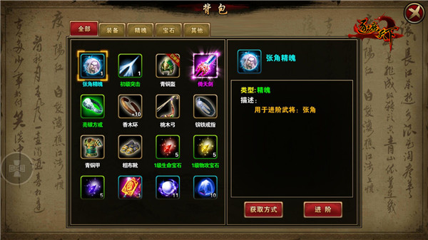 《问鼎天下》拥有丰富多样的物品类型和玩法。背包系统主要用来容纳游戏中所有产出道具,方便玩家查看和使用。