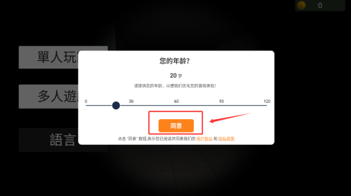 步骤1:滑动选择年龄(20岁),并点击红框中的同意按钮以继续游戏。