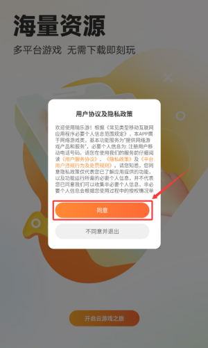 阅读用户协议后,点击红框标注的“同意”按钮继续使用。