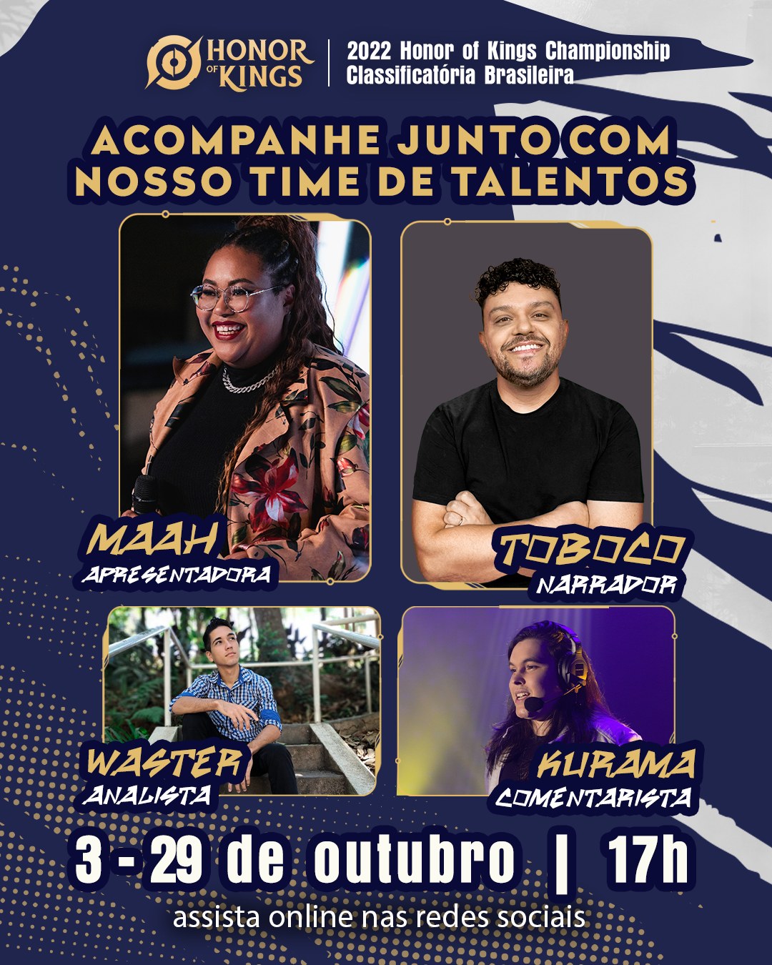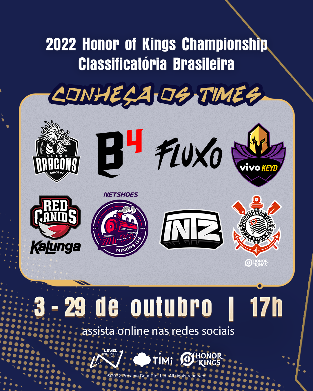 选拔赛小组赛已于北京时间10月4日凌晨4点开始,共有8支巴西的战队参赛,他们分别是B4、Black Dragons、Corinthians、INTZ、FLUXO、Netshoes Miners、Red Canids Kalunga 和 Vivo Keyd。比赛配有专业解说团队带领观众一同感受王者荣耀电竞的魅力。