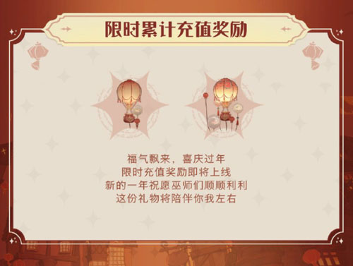 作为新春充值活动的配套福利,限时累计充值奖励也将上线。届时,巫师只要充值累计一定数额,即可解锁神秘奖励哦!