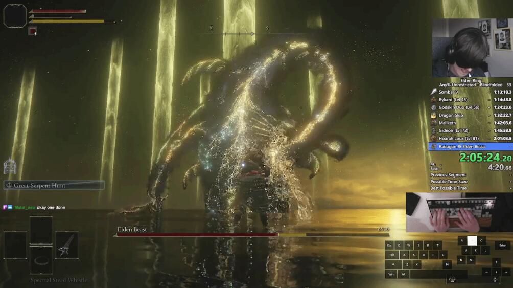 近日,Pennek蒙眼直播速通了《艾尔登法环》。计时显示他最终花费了两小时6分钟。由于该作是开放世界玩法,所以速通还是存在一定难度的。