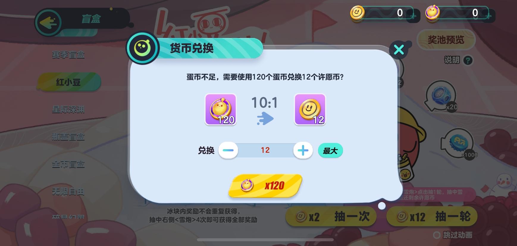 1、蛋仔派对游戏中,许愿币可以使用蛋仔币进行兑换获得。120个蛋仔币可以兑换12个许愿币。