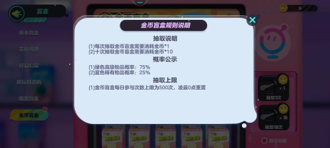 4、每次抽取金币盲盒需要消耗一个金币,抽取十连抽需要消耗10个金币,绿色高级物品概率为75%,蓝色稀有物品概率为25%,每天抽取金币盲盒的上限是500次,凌晨0点重置。