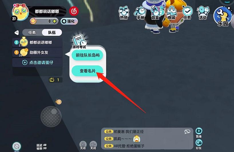 1.玩家可以在游戏公共频道或者队伍中进行举报,点击想要举报的玩家名字,选择查看名片选项。