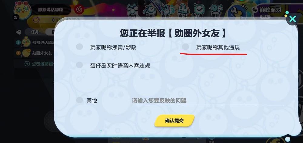 3.点击之后玩家需要选择想要举报的问题,其中就可以举报玩家昵称其他违规,点击勾选之后提交即可。