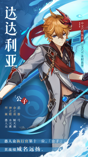 达达利亚定位是一名【水系弓箭C】,特点是【水系AOE伤害高】。从阵容构成的角度来看,如果你一队或者二队缺少一名强力的输出手,可以考虑抽一个达达利亚作为主C培养。