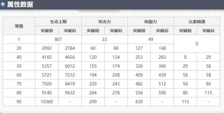 40级的时候突破后增加29元素精通、50级的时候突破前增加29元素精通、突破后增加58元素精通,60级突破前增加58精通、突破后增加58精通,70级突破前增加58精通、突破后增加86精通,80级突破前增加86精通、突破后增加115精通,90级增加115精通。