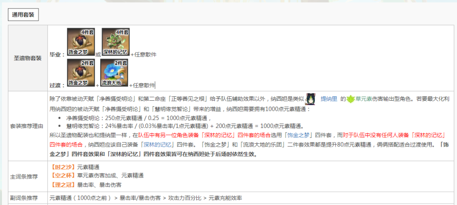 「饰金之梦」和「流浪大地的乐团」二件套效果都是提升80点元素精通,俩俩搭配适合过渡使用。「饰金之梦」四件套效果和「深林的记忆」四件套效果皆可在纳西妲处于后场时依然生效。