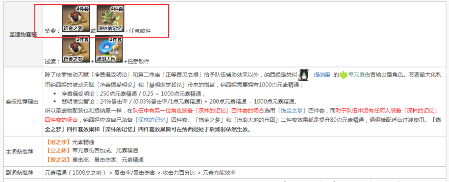 纳西妲的圣遗物配装也和提纳里一样,在队伍中有另一位角色装备「深林的记忆」四件套的场合选用「饰金之梦」四件套,而对于队伍中没有任何人装备「深林的记忆」四件套的场合,纳西妲应该自己装备「深林的记忆」四件套。