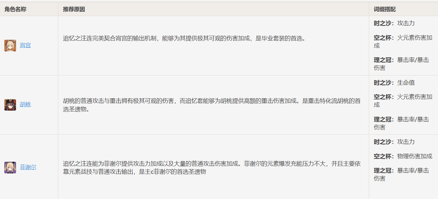 根据角色来决定需要的属性。追忆套圣遗物一般适合宵宫、胡桃和菲谢尔。当玩家给宵宫使用的时候,要主堆攻击力、火伤和暴击暴伤属性。当玩家给胡桃使用的时候,要主堆生命值、火伤和暴击暴伤属性。当玩家给菲谢尔使用的时候,要主堆攻击力、物伤和暴击暴伤属性。