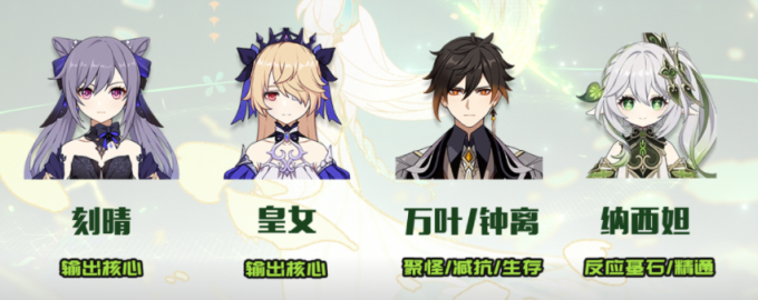 阵容三:刻晴 皇女 钟离 纳西妲。此阵容一样是激化为主的输出队伍,刻晴高频低倍率的特点完美契合以倍率乘区提供增益的激化反应,再搭配纳西妲的高额精通和后台伤害机制,使得队伍整体的输出能力得到大大的提升。