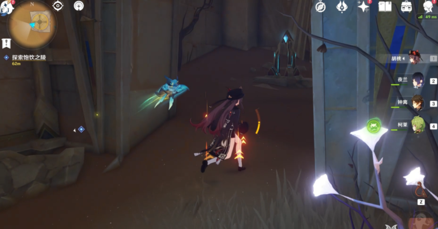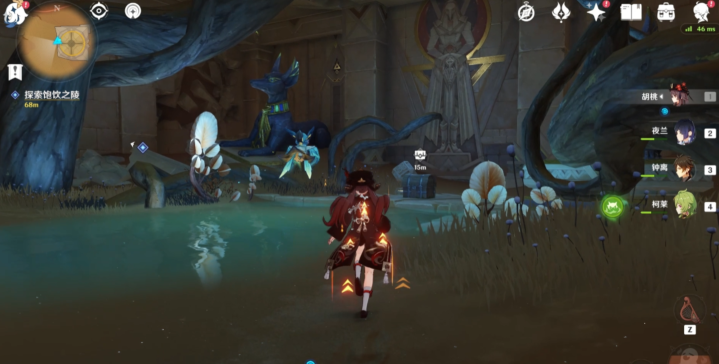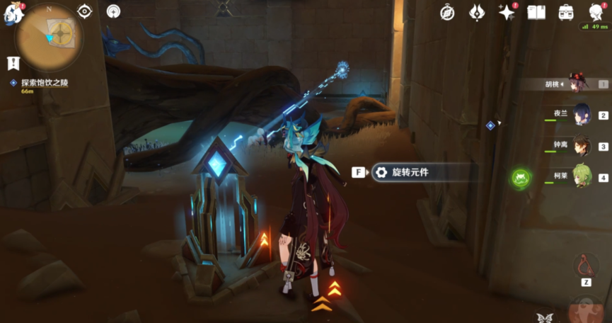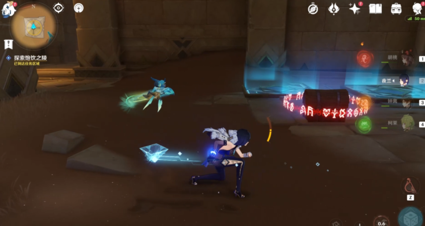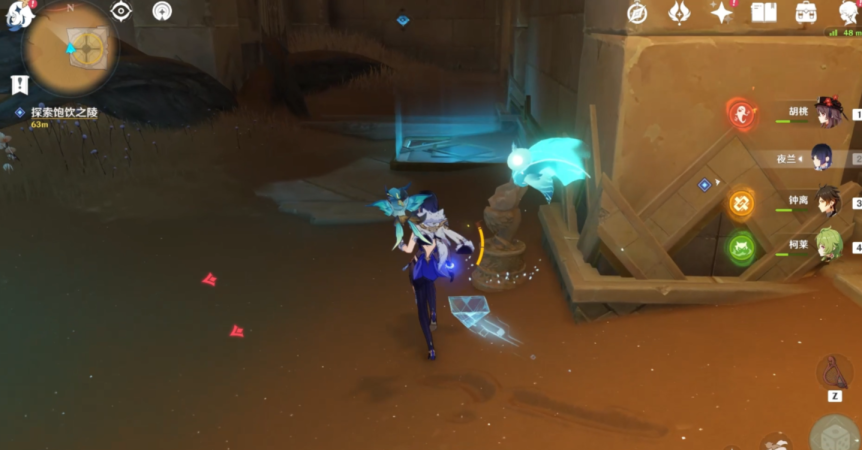 来到任务点进入饱饮之陵,先点击门口的红色立柱,将其转化为蓝色,然后从右边大门进入,能看见两个蓝色方块,旁边就是蓝色三角,使用蓝色三角解锁其中一个方块,等候三角刷新,然后继续激活第二个。