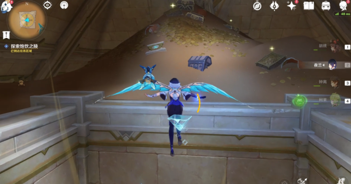 机关开启后回到门口,利用立柱前的风场飞上去,能看见一个宝箱,打开后获得任务物品,饱饮之陵探索完成。