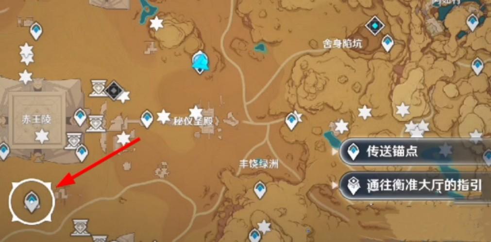 1、我们打开须弥沙漠地图,找到下图的传送点,点击会有额外的【通往衡准大厅的指引】,点击传送。