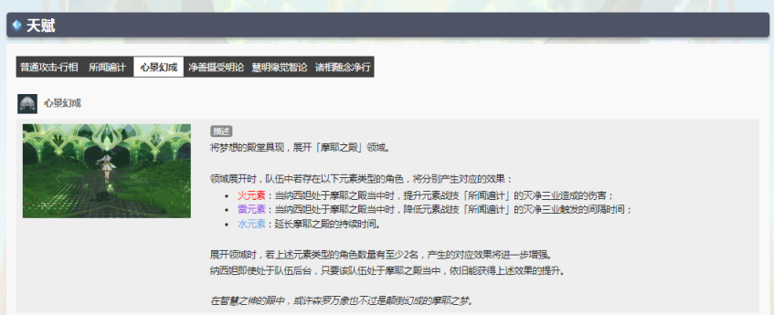 草神开启大招之后,如果队伍里有雷元素角色,就可以降低元素战技的攻击间隔,而元素战技每次攻击都拥有独立附着,这就让元素战技的挂草频率变高了。同时如果开启大招后,队伍里还有火元素角色的话,则可以提高元素战技的伤害,有水元素角色的话还可以增加大招的持续时间。