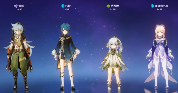 配队二:雷泽 行秋 草神 心海。这个阵容可以双水共鸣,同时纳西妲和雷泽一样可以打出激化反应,行秋的挂水和心海的挂水治疗,也让雷泽的输出环境很舒服。