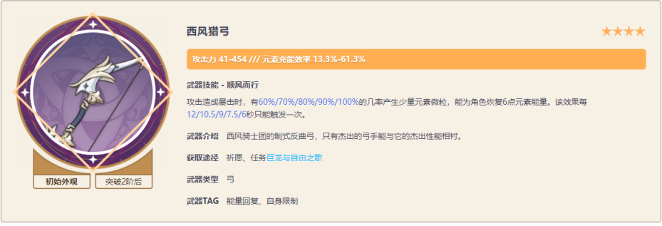 西风猎弓副词条提高元素充能效率的武器满级后副属性提供61.3%元素充能效率,装备此弓在攻击暴击后产生能量颗粒,算是四星毕业武器。