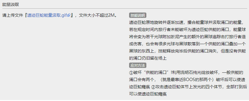 有两种瘫痪的方式:第一种是当遗迹巨蛇原地旋转并加速钻入地下后,再次出来会生成四个淤泥涌口,玩家使用流明石即可消除这些淤泥涌口(一般只用消除供能的两个涌口即可),消除完毕可以使其瘫痪。