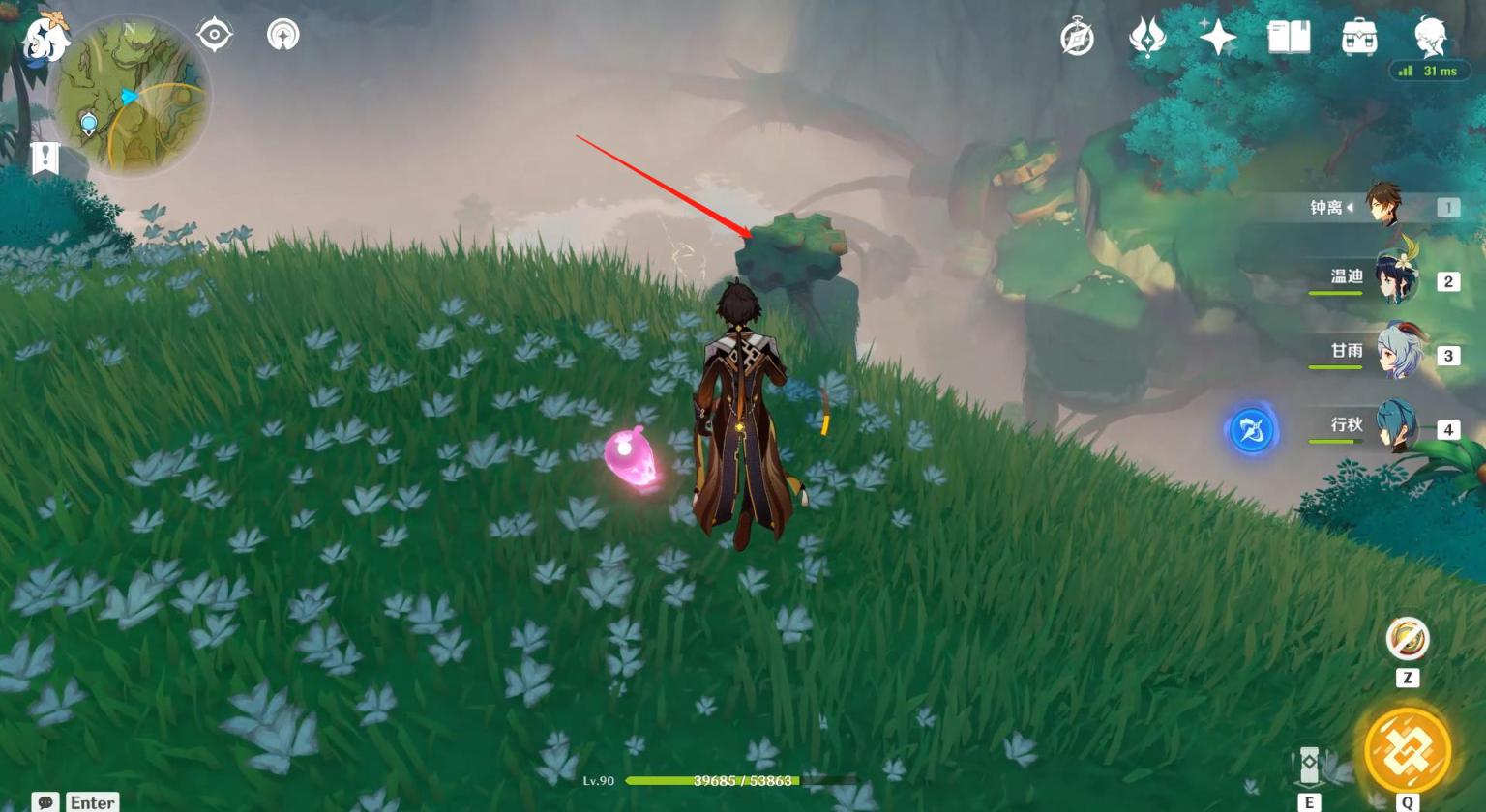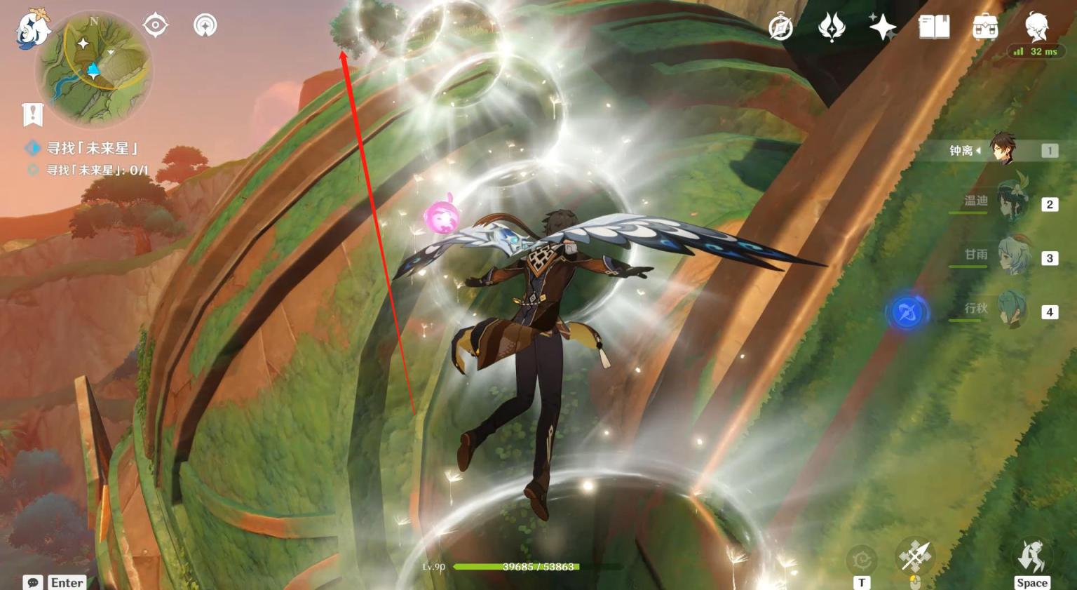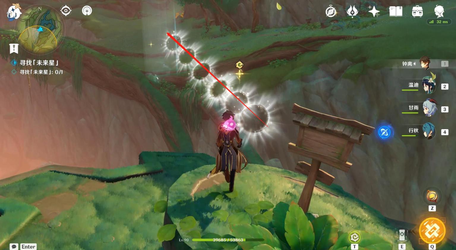 4、观察后西南方向会出现四叶印、加速光圈以及风场,利用四叶印去到加速光圈前再经过加速光圈到达风场的位置。