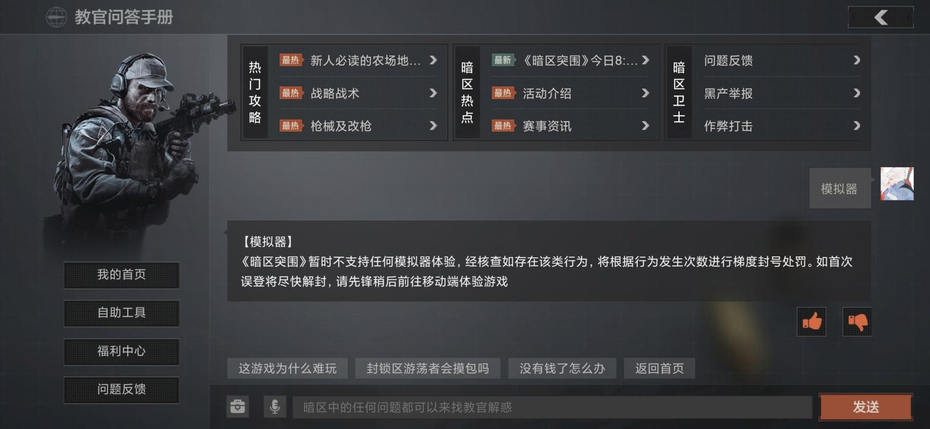 3、最后玩家进入教官问答手册界面,输入模拟器,系统会回答该游戏暂时不支持任何模拟器体验,经核查如存在该类行为,将根据行为发生次数进行梯度封号处罚。