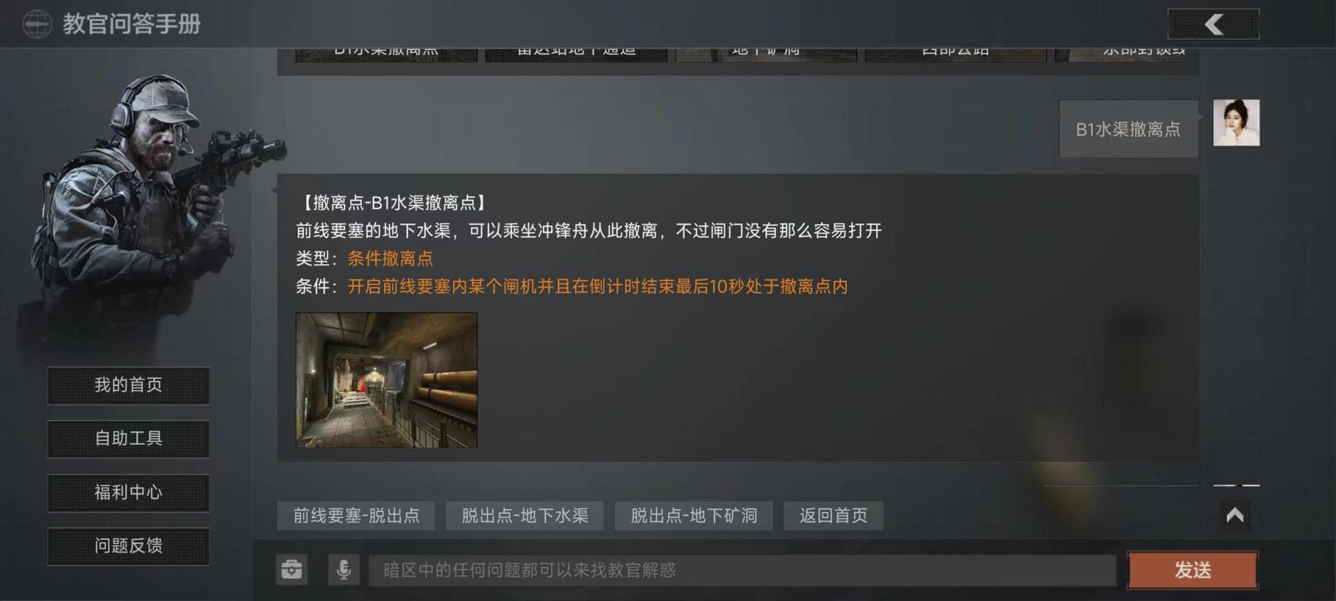 前线要塞里有三个撤离点,分别是地下撤离拉闸点,需要开启前线要塞内某个闸机并且在倒计时结束最后10秒内处于撤离点,拉闸的具体位置是水渠的拉闸点位置在二楼的控制室里面