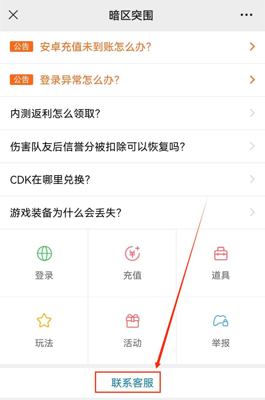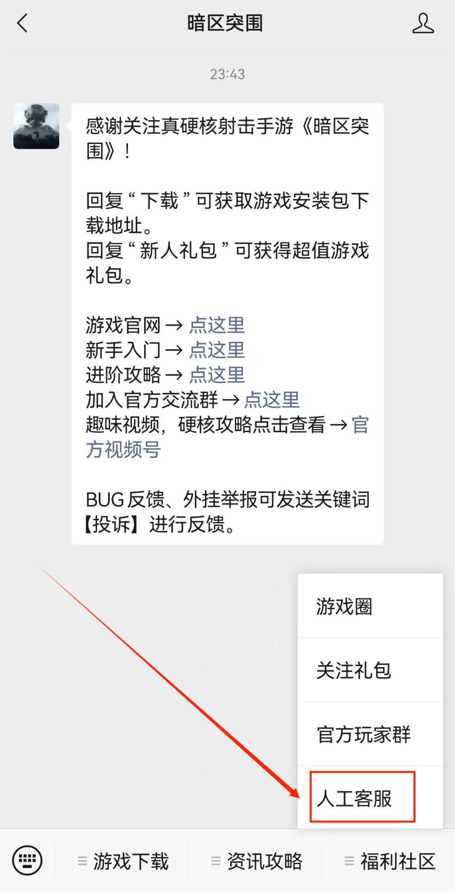 1、关注暗区突围的微信公众号,之后点击右下角福利社区的人工客服。