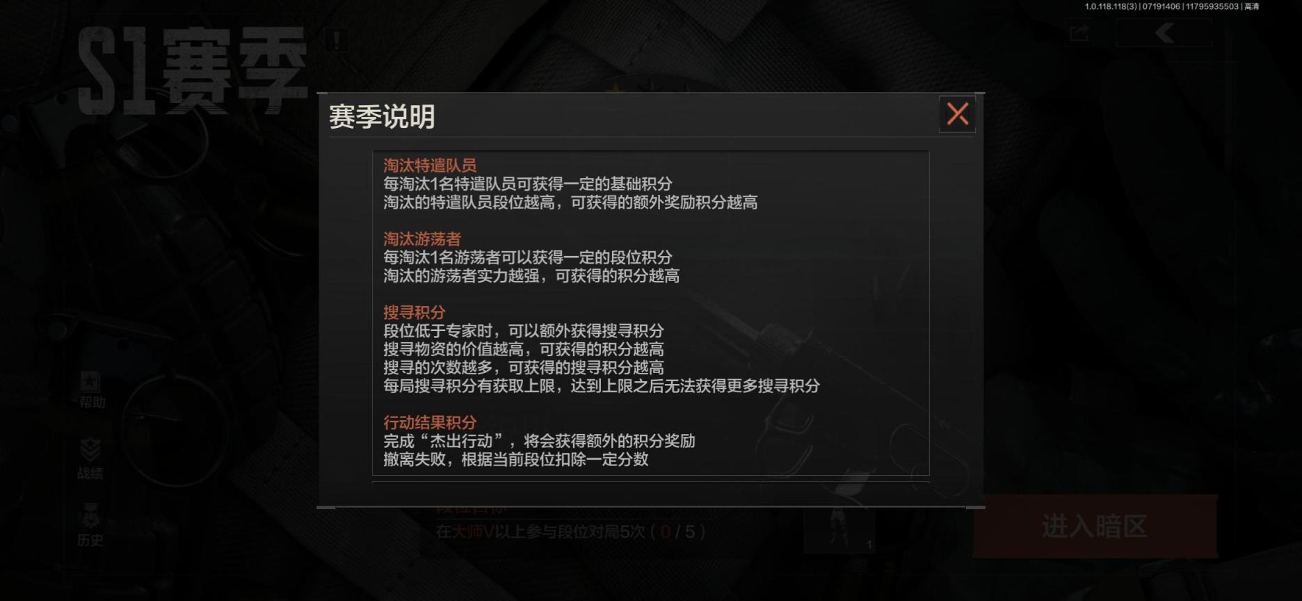暗区突围段位积分分为淘汰积分与搜寻积分,在游戏中,我们每次淘汰一个对手,就可以获得积分,其中我们的段位越高,在淘汰敌人后,获得的积分就会越多;而段位还在新锐、尖兵、精英的时候,我们可以选择搜寻积分来获得积分,在我们的搜寻高价值的物资后,所获得的积分也会很多的,这样就能快速升段位。