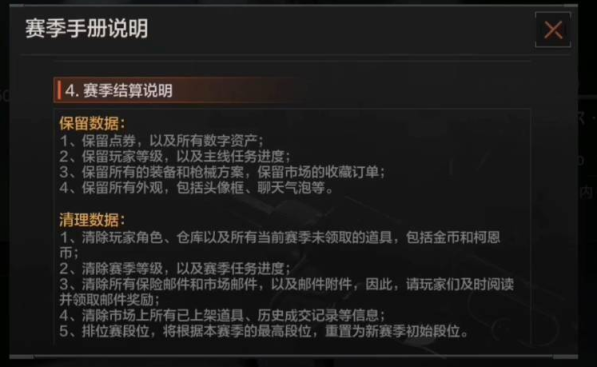 根据下图暗区突围赛季手册说明,赛季结算时会删档,删档保留的东西有玩家的点券及所有数字资产、等级以及主线任务进度、所有的装备和枪械方案市场收藏的订单和外观,包括头像框、聊天气泡等。