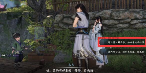 5、然后东东从宝箱拿宝物给我们,对话选择:选兰溪-解玉砂,给东东内功心法。
