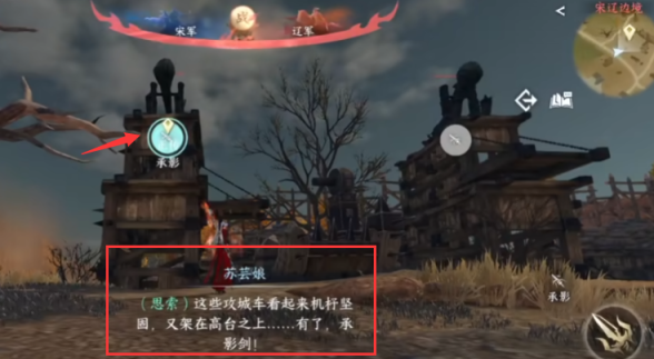 1、使用承影剑即可摧毁投石车。在攻打辽军的剧情中,有一段是需要摧毁辽军投石车,站到投石机下面,点击承影,就会飞到上面,之后点击攻击就可以摧毁了。