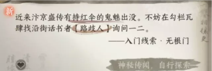 无根门入派线索需要去汴京勾栏瓦肆(甜水巷旁边)。