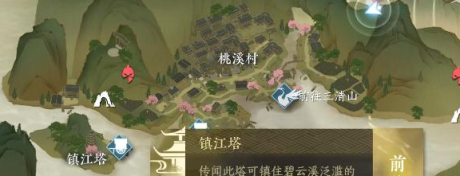 3、紧接着打开桃溪村地图前往【镇江塔】,寻找NPC【南郭子】对话,触发领取【空谷桃花】任务。