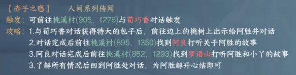 2、对话完成后前往桃溪村(895,1350)找到阿良打听关于阿胜的故事。