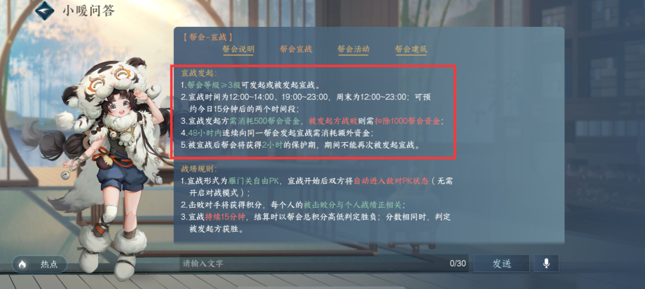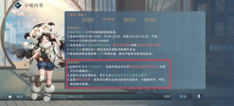 帮会战场规则是宣战形式为雁门关自由PK,宣战开始后双方将自动进入敌对PK状态(无需开启对战模式) ,击败对手将获得积分,每个人的被击败分与个人战绩正相关,宣战持续15分钟,结算时以帮会总积分高低判定胜负;分数相同时,判定被发起方获胜。