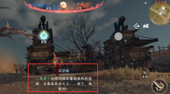 使用承影剑即可摧毁投石车。在攻打辽军的剧情中,有一段是需要打投石机,站到投石机下面,点击承影,就会飞到上面摧毁投石车。承影是指一个技能使用后就可以让你输送到另外一个部位,是很不错的偏移技能。