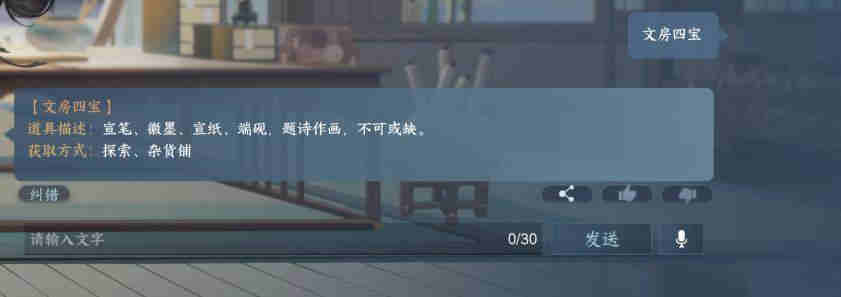 文房四宝可以通过探索或则杂货铺获得,道具描述:宣笔、徽墨、宣纸、端砚,题诗作画,不可或缺。