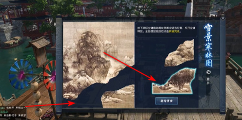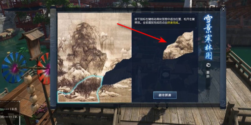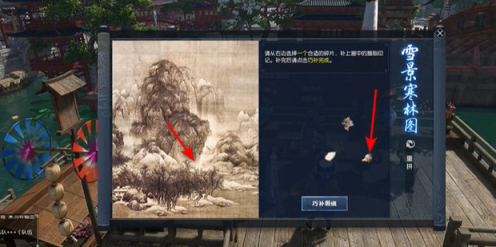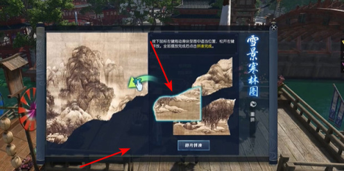 1、首先做主线任务知己觅海内任务中段时需要玩家进行拼图,现将红色箭头指向的来自拼图放到右下角。