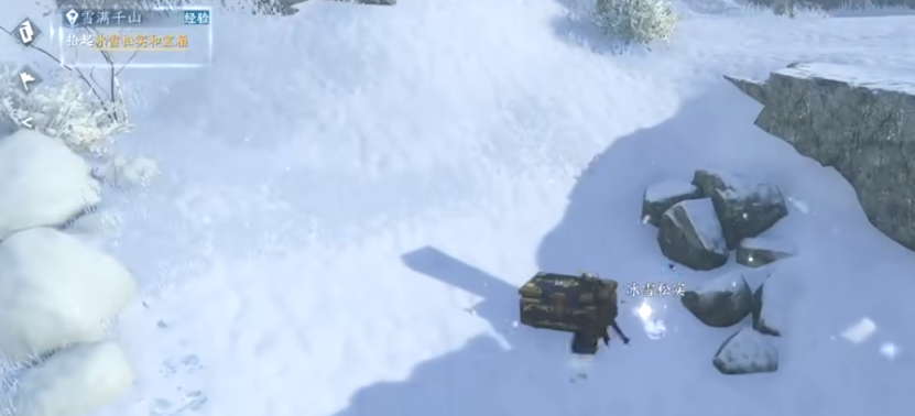 接着冰面会破碎,会掉落到下方,可以看到地面上有冰雪松实和箱子,捡起来就可以获得奖励,雪满千山就过了。