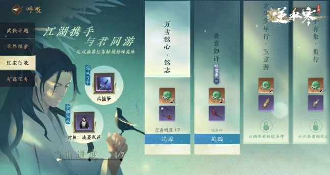 通过主界面上方呼吸-红尘行歌-万古铭心,接取“万古铭心”华章任务(这也是手游独有的文物保护主题任务)。