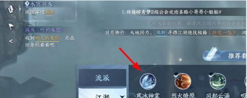3、紧接着需要试图穿过瀑布,瀑布水流湍急,思考如何通过,选择江湖技能【寒冰神掌】将水流冰封,然后打破后就能进入。