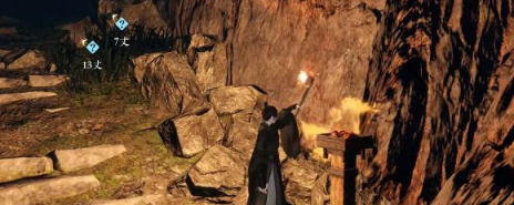 4、进入瀑布内可以看到一处洞穴,取下墙壁上的火把用来照明。