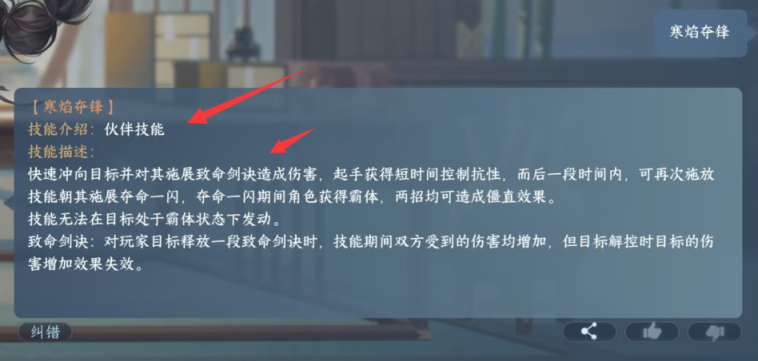 快速冲向目标并对其施展致命剑诀造成伤害,起手获得短时间控制抗性,而后一段时间内,可再次施放技能朝其施展夺命一闪,夺命一闪期间角色获得霸体,两招均可造成僵直效果。技能无法在目标处于霸体状态下发动。致命剑诀:对玩家目标释放一段致命剑诀时,技能期间双方受到的伤害均增加,但目标解控时目标的伤害增加效果失效。