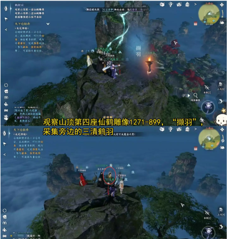 第四座雕像在1271,897位置,解锁任务“撷羽”,直接触碰山上的羽毛即可,可以看到一缕青烟飘向中间山脉。