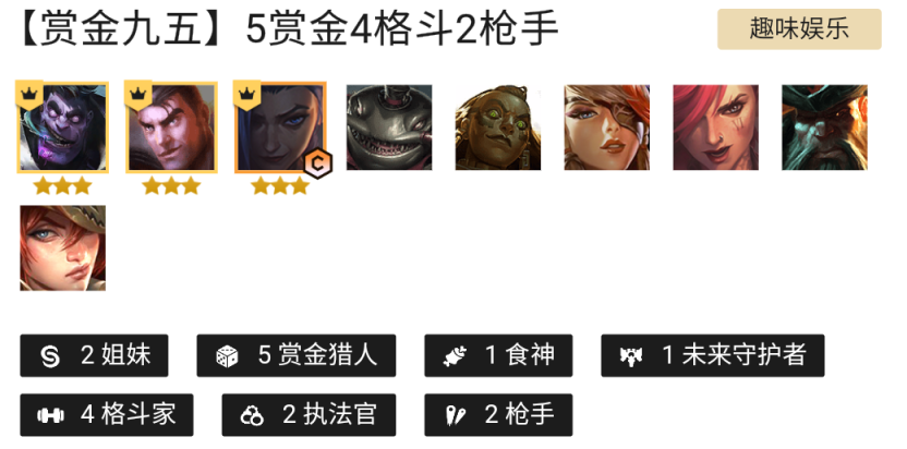 金铲铲之战赏金猎人阵容推荐玩【赏金九五】5赏金4格斗2枪手,具体攻略如下: