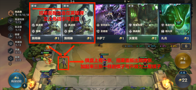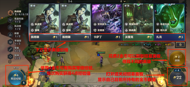 返回自己的棋盘后,可以从上方招募面板使用英雄下方显示的对应金币来招募自己心仪的棋子。点击招募面板的英雄,即可将英雄招募到自己的备战区,右下角的圆形按钮可以关闭或打开招募面板,按钮中的数字即自己目前所拥有的金币数量。左下角的圆形按钮是是购买经验按钮,花费4金币可以购买4经验值。