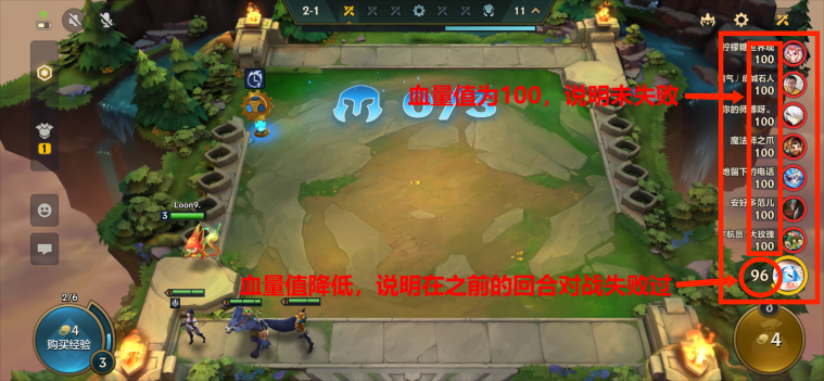 每位玩家都会拥有一名自己的小小英雄,每个小小英雄的初始血量值为100点。每回合对战胜利,不扣血量值;每回合对战失败,会根据胜利方存活的棋子数量以及棋子等级对失败方造成伤害。血量值为0,则被淘汰。右侧的玩家顺序即代表玩家目前的名次。